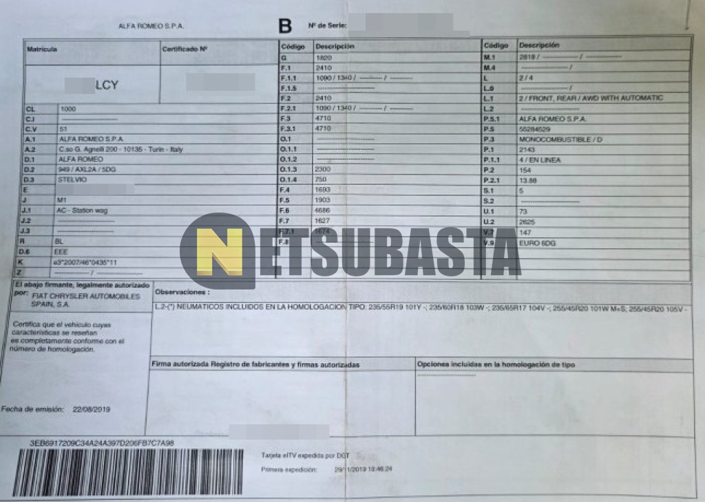 Subasta de Alfa Romeo Stelvio 2.2 Diesel AT8 Q4 2019 Averiados, Marca Alfa Romeo, Modelo Stelvio 2.2 Diesel AT8 Q4, Combustible Diésel, Kilometraje 135.000 KM, Fecha 1ª matriculación 11/2019, Matrícula ****LCY, Color Exterior , Color Interior , IVA REBU y Ubicación Valencia.