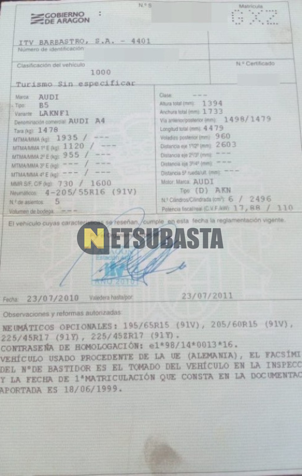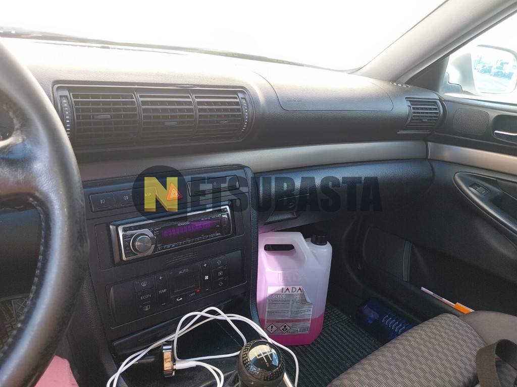 Subasta de Audi A4 2.5 TDI 1999 Averiados, Marca Audi, Modelo A4 2.5 TDI, Combustible Diésel, Kilometraje 405.000 KM, Fecha 1ª matriculación 06/1999, Matrícula ****GXZ, Color Exterior , Color Interior , IVA REBU y Ubicación Navarra.