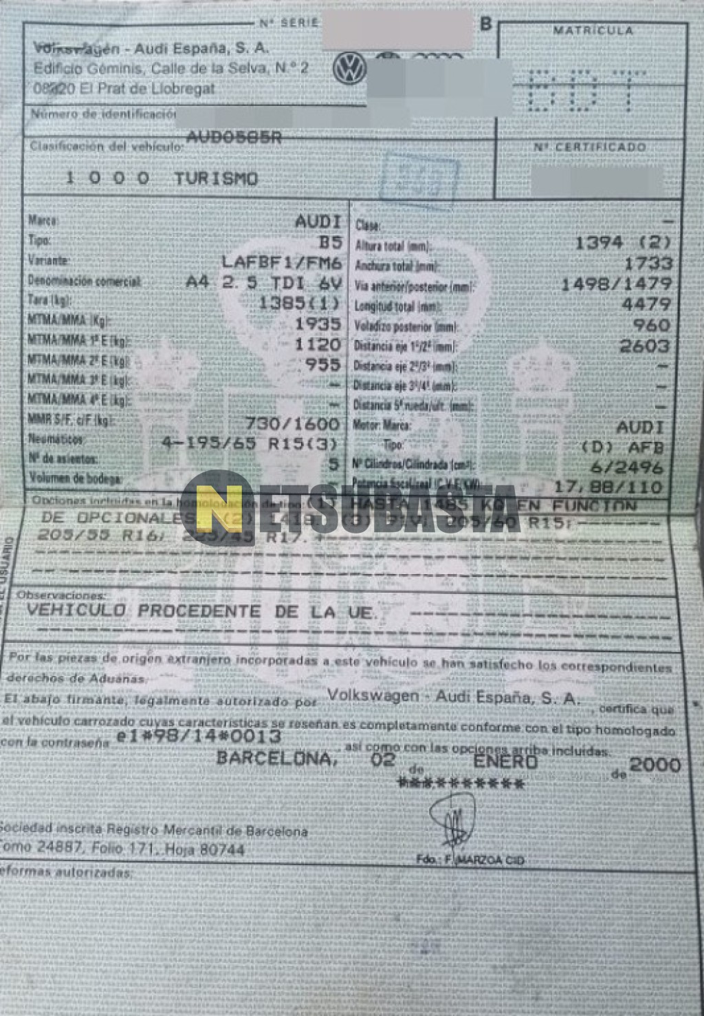 Subasta de Audi A4 2.5 TDI 2000 Averiados, Marca Audi, Modelo A4 2.5 TDI , Combustible Diésel, Kilometraje 254.000 KM, Fecha 1ª matriculación 12/2000, Matrícula ****BDT, Color Exterior , Color Interior , IVA REBU y Ubicación Tarragona.