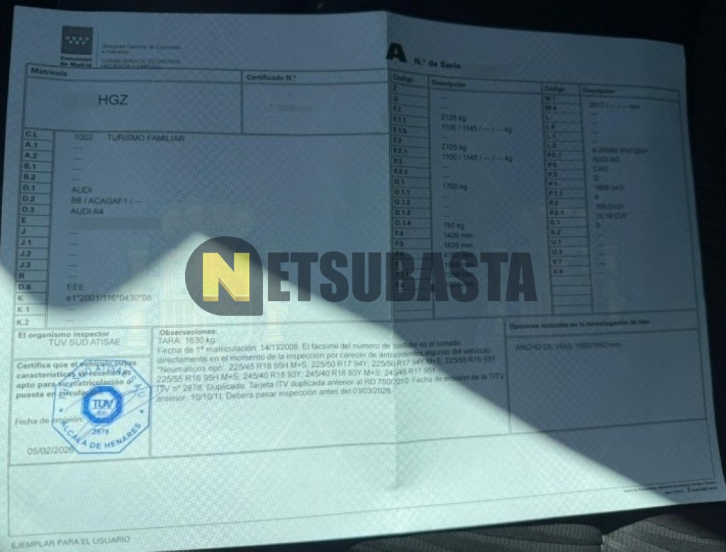 Subasta de Audi A4 Avant 2.0 TDI multitronic DPF 2008 Averiados, Marca Audi, Modelo A4 Avant 2.0 TDI multitronic DPF, Combustible Diésel, Kilometraje 335.000 KM, Fecha 1ª matriculación 11/2008, Matrícula ****HGZ, Color Exterior , Color Interior , IVA REBU y Ubicación Guadalajara.
