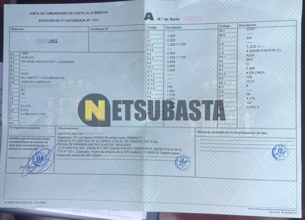 Subasta de Audi Cabrio 2.5 TDI multitronic 6 vel. 2003 Averiados, Marca Audi, Modelo Cabrio 2.5 TDI multitronic 6 vel., Combustible Diésel, Kilometraje 234.000 KM, Fecha 1ª matriculación 05/2003, Matrícula ****JSG, Color Exterior , Color Interior , IVA REBU y Ubicación Jaén.
