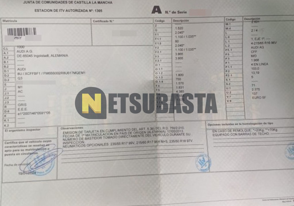 Subasta de Audi Q3 2.0 TDI 2013 Siniestrados, Marca Audi, Modelo Q3 2.0 TDI, Combustible Diésel, Kilometraje 190.000 KM, Fecha 1ª matriculación 05/2013, Matrícula ****MNY, Color Exterior , Color Interior , IVA REBU y Ubicación Jaén.