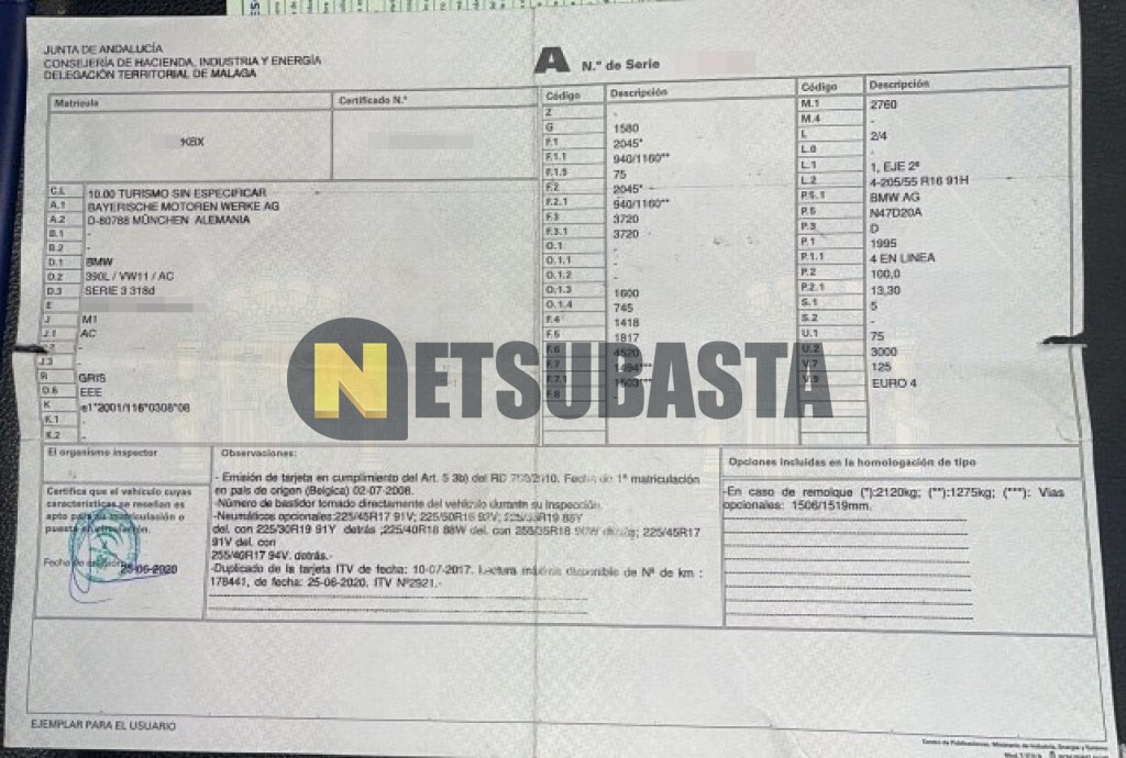 Subasta de Bmw 318d Touring 2008 Averiados, Marca Bmw, Modelo 318d Touring, Combustible Diésel, Kilometraje 250.000 KM, Fecha 1ª matriculación 07/2008, Matrícula ****KBX, Color Exterior , Color Interior , IVA REBU y Ubicación Málaga.