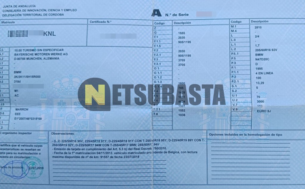Subasta de Bmw 318d Touring 2013 Averiados, Marca Bmw, Modelo 318d Touring, Combustible Diésel, Kilometraje 208.000 KM, Fecha 1ª matriculación 11/2013, Matrícula ****KNL, Color Exterior , Color Interior , IVA REBU y Ubicación Córdoba.