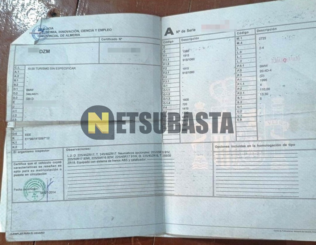 Subasta de Bmw 320d 2003 Averiados, Marca Bmw, Modelo 320d, Combustible Diésel, Kilometraje 350.000 KM, Fecha 1ª matriculación 02/2003, Matrícula ****DZM, Color Exterior , Color Interior , IVA REBU y Ubicación Guadalajara.