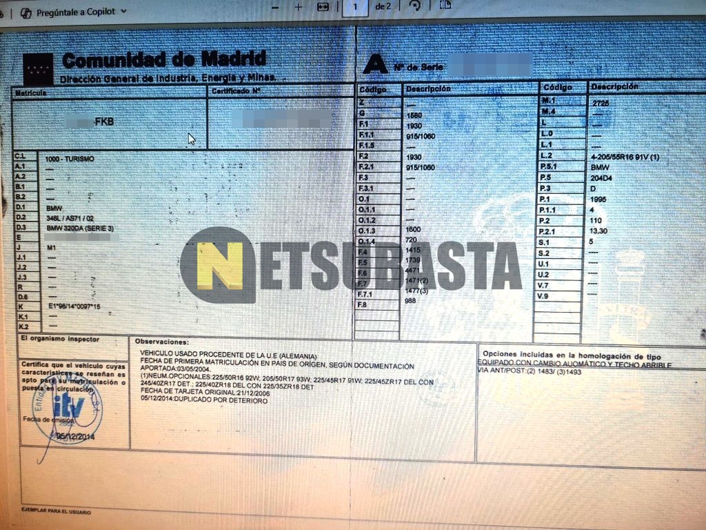 Subasta de Bmw 320d Aut. 2004 Siniestrados, Marca Bmw, Modelo 320d Aut., Combustible Diésel, Kilometraje 158.000 KM, Fecha 1ª matriculación 05/2004, Matrícula ****FKB, Color Exterior , Color Interior , IVA REBU y Ubicación Madrid.