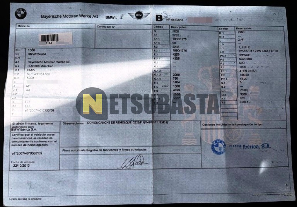 Subasta de Bmw 520d Aut. 2013 Averiados, Marca Bmw, Modelo 520d Aut., Combustible Diésel, Kilometraje 245.000 KM, Fecha 1ª matriculación 10/2013, Matrícula ****HTJ, Color Exterior , Color Interior , IVA REBU y Ubicación Vizcaya.