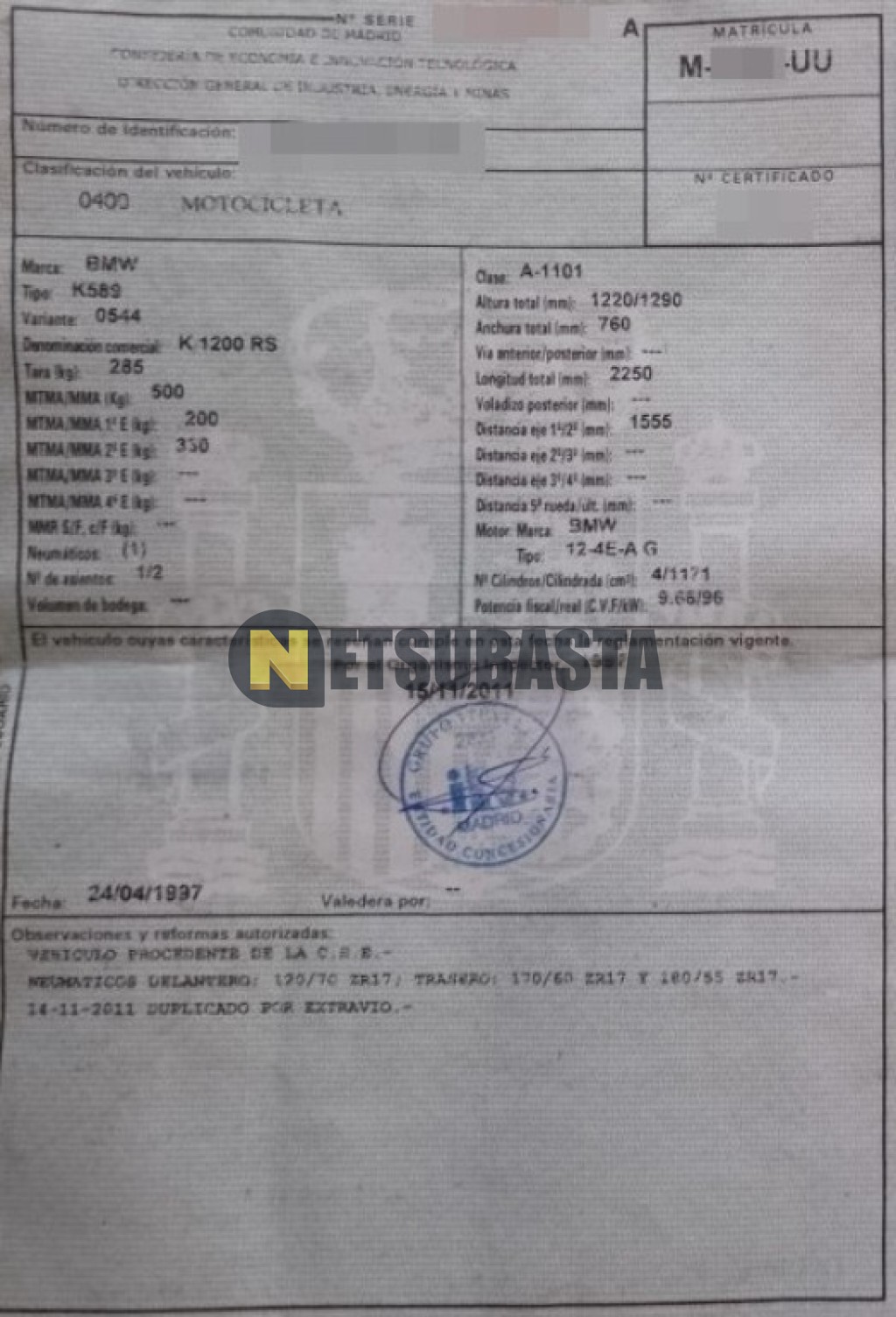 Subasta de BMW K 1200 RS 1997 Siniestrados, Marca BMW , Modelo K 1200 RS, Combustible Gasolina, Kilometraje 138.000 KM, Fecha 1ª matriculación 06/1997, Matrícula M****UU, Color Exterior , Color Interior , IVA REBU y Ubicación Madrid.
