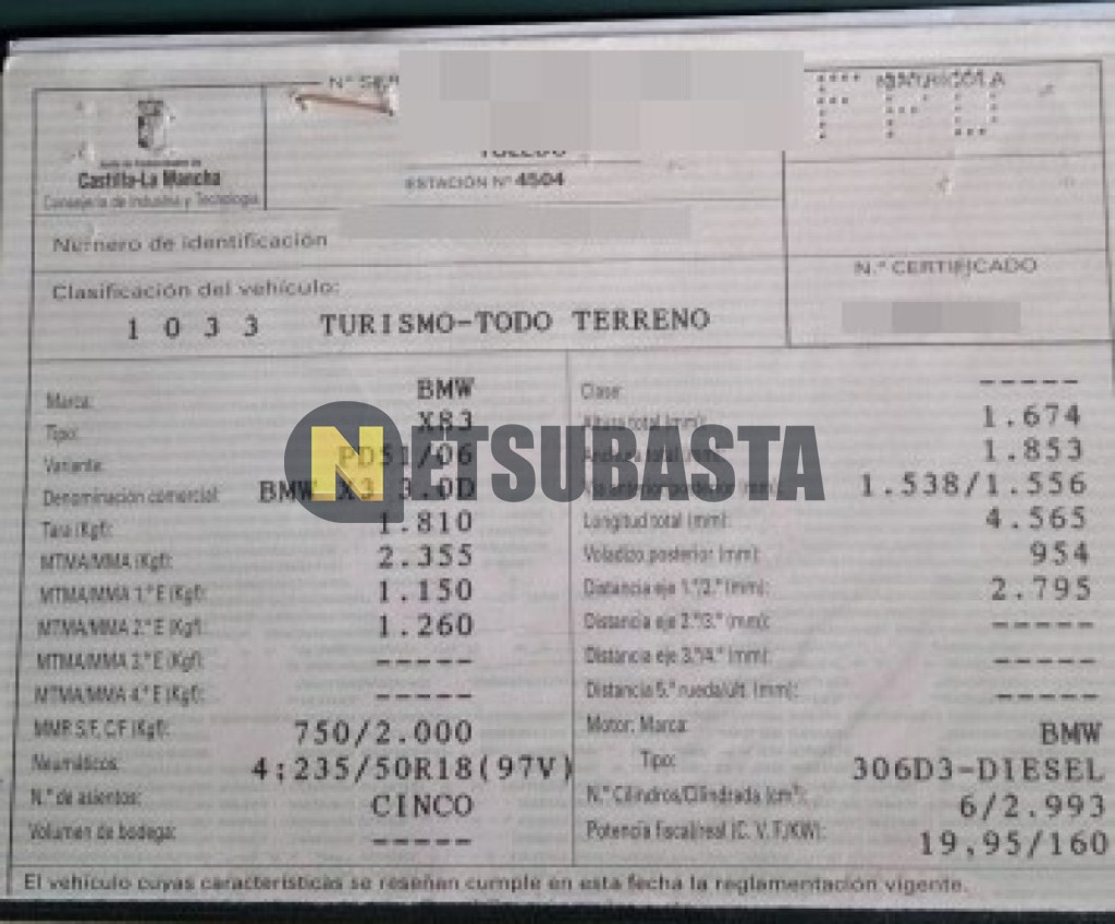 Subasta de Bmw X3 3.0d Aut. 2006 Averiados, Marca Bmw, Modelo X3 3.0d Aut., Combustible Diésel, Kilometraje 367.000 KM, Fecha 1ª matriculación 07/2006, Matrícula ****FPD, Color Exterior , Color Interior , IVA REBU y Ubicación Valencia.