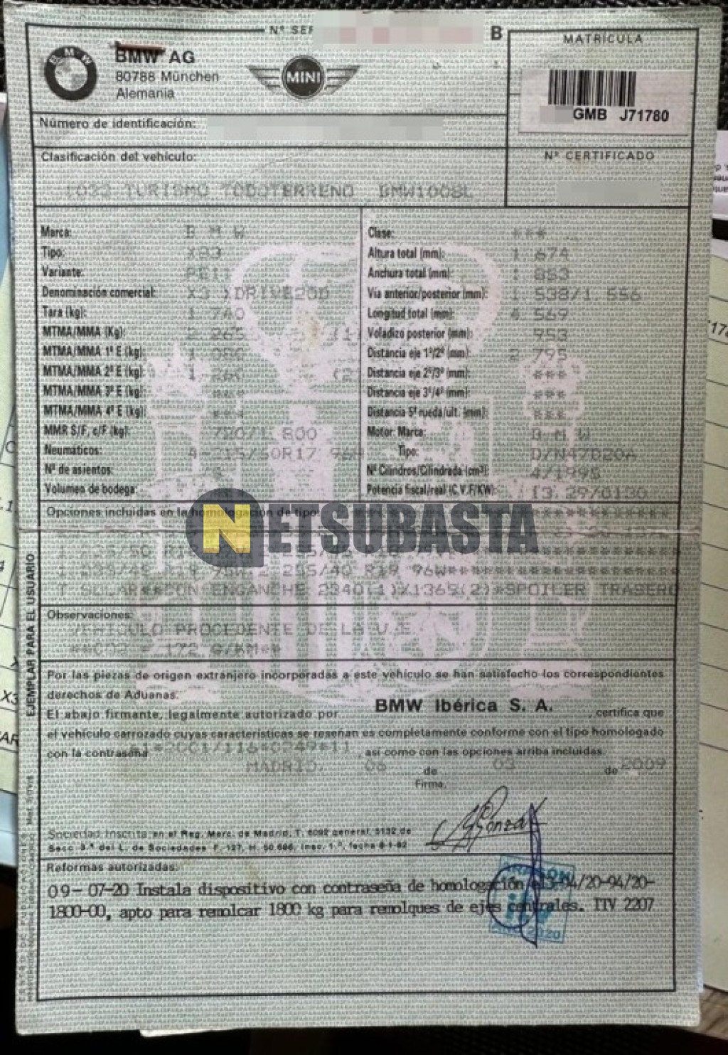 Subasta de Bmw X3 xDrive20d Aut. 2009 Averiados, Marca Bmw, Modelo X3 xDrive20d Aut., Combustible Diésel, Kilometraje 358.000 KM, Fecha 1ª matriculación 04/2009, Matrícula ****GMB, Color Exterior , Color Interior , IVA REBU y Ubicación Soria.