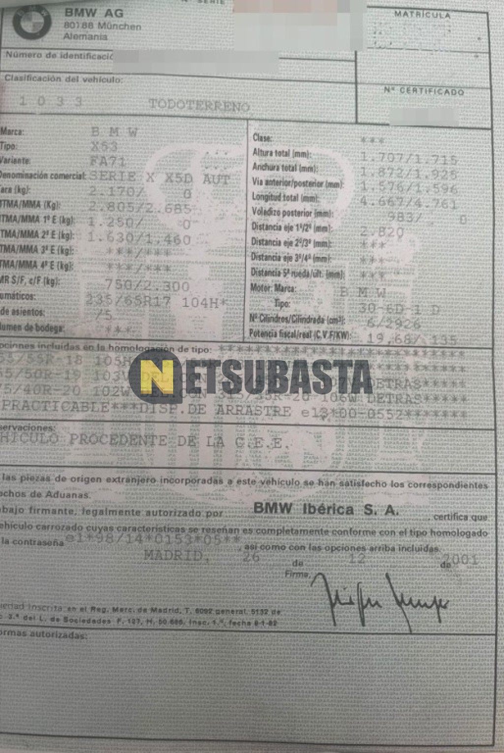 Subasta de Bmw X5 3.0dA 2002 Averiados, Marca Bmw, Modelo X5 3.0dA, Combustible Diésel, Kilometraje 328.000 KM, Fecha 1ª matriculación 01/2002, Matrícula ****BRZ, Color Exterior , Color Interior , IVA REBU y Ubicación Valencia.