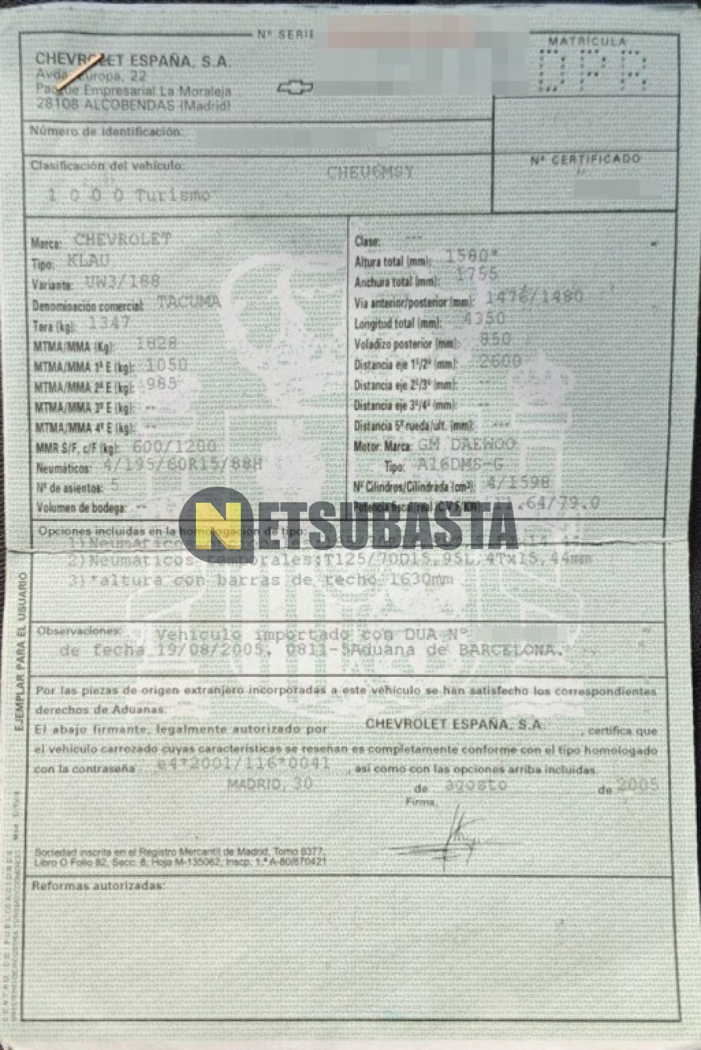 Subasta de Chevrolet Tacuma 1.6 16v 2005 Averiados, Marca Chevrolet, Modelo Tacuma 1.6 16v, Combustible Gasolina, Kilometraje 100.000 KM, Fecha 1ª matriculación 09/2005, Matrícula ****DPR, Color Exterior , Color Interior , IVA REBU y Ubicación Valencia.