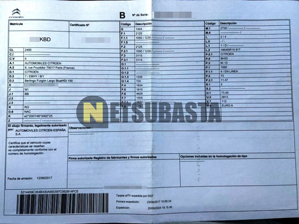 Subasta de Citroën Berlingo 1.6 BlueHDi 2017 Averiados, Marca Citroën, Modelo Berlingo 1.6 BlueHDi, Combustible Diésel, Kilometraje 120.000 KM, Fecha 1ª matriculación 06/2017, Matrícula ****KBD, Color Exterior , Color Interior , IVA REBU y Ubicación Guadalajara.