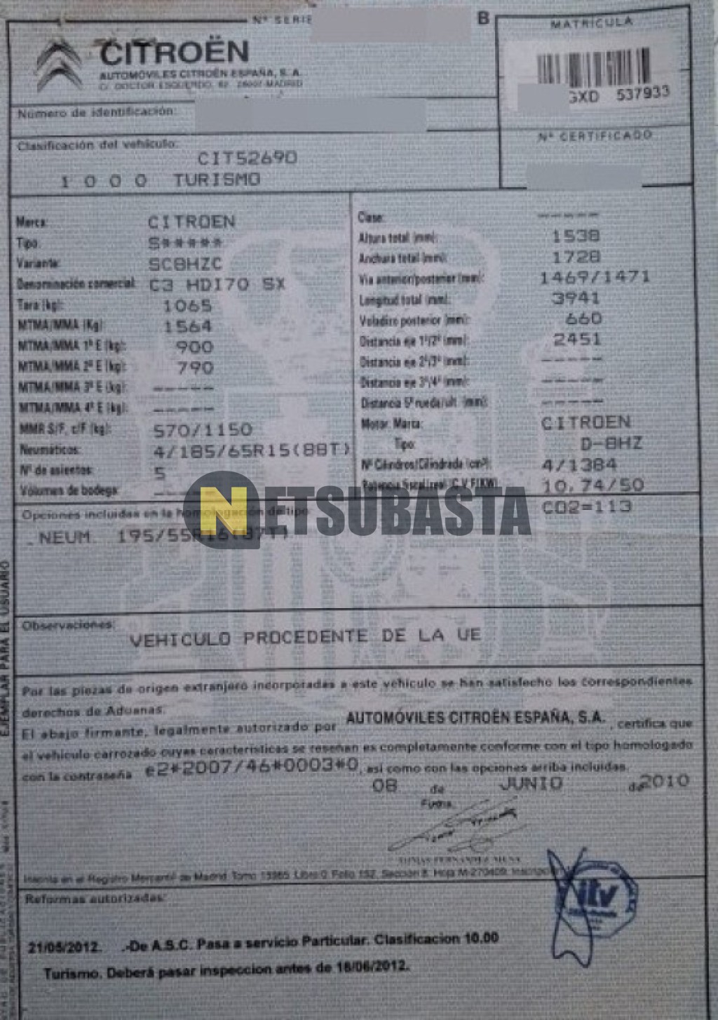 Subasta de Citroën C3 1.4 HDi 2010 Averiados, Marca Citroën, Modelo C3 1.4 HDi, Combustible Diésel, Kilometraje 360.000 KM, Fecha 1ª matriculación 06/2010, Matrícula ****GXD, Color Exterior , Color Interior , IVA REBU y Ubicación Valencia.