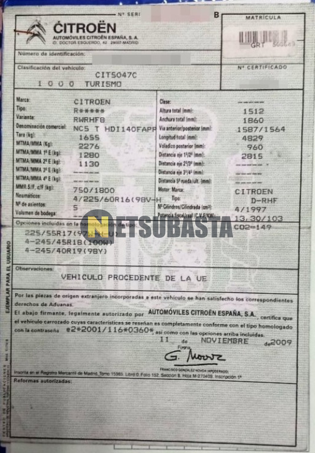 Subasta de Citroën C5 Tourer 2.0 HDi 2009 Averiados, Marca Citroën, Modelo C5 Tourer 2.0 HDi, Combustible Diésel, Kilometraje 195.000 KM, Fecha 1ª matriculación 11/2009, Matrícula ****GRT, Color Exterior , Color Interior , IVA REBU y Ubicación Zaragoza.