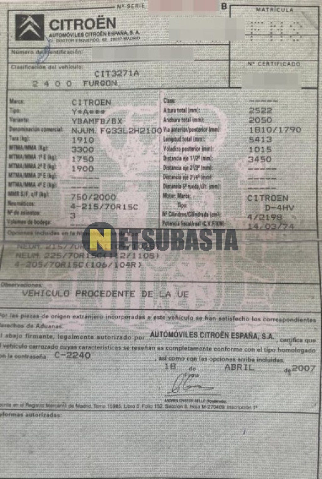 Subasta de Citroën Jumper Furgon 2.2 HDI 2007 Averiados, Marca Citroën, Modelo Jumper Furgon 2.2 HDI, Combustible Diésel, Kilometraje 495.000 KM, Fecha 1ª matriculación 04/2007, Matrícula ****FNS, Color Exterior , Color Interior , IVA REBU y Ubicación Madrid.
