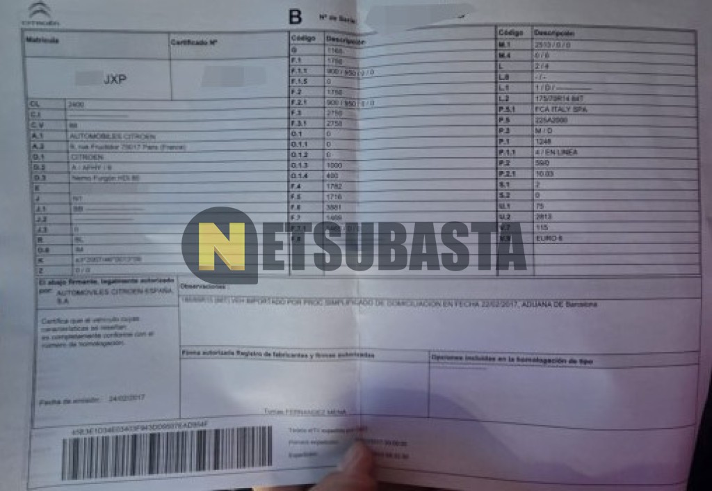 Subasta de Citroën Nemo 1.3 HDi 2017 Averiados, Marca Citroën, Modelo Nemo 1.3 HDi, Combustible Diésel, Kilometraje 342.000 KM, Fecha 1ª matriculación 03/2017, Matrícula ****JXP, Color Exterior , Color Interior , IVA REBU y Ubicación Cuenca.