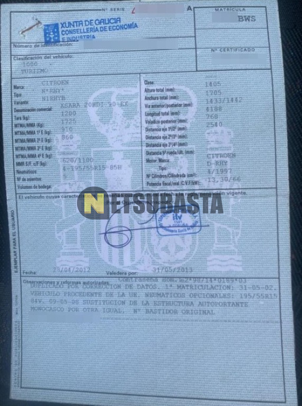 Subasta de Citroën Xsara 2.0 HDi 2002 Averiados, Marca Citroën, Modelo Xsara 2.0 HDi, Combustible Diésel, Kilometraje 340.000 KM, Fecha 1ª matriculación 05/2002, Matrícula ****BWS, Color Exterior , Color Interior , IVA REBU y Ubicación La Coruña.