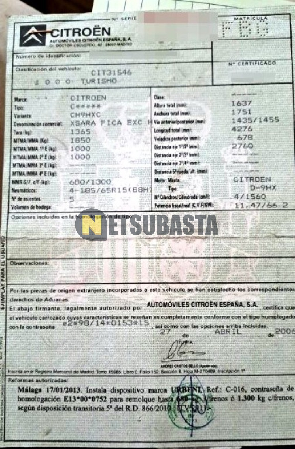 Subasta de Citroën Xsara Picasso 1.6 HDi 2006 Averiados, Marca Citroën, Modelo Xsara Picasso 1.6 HDi, Combustible Diésel, Kilometraje 245.000 KM, Fecha 1ª matriculación 06/2006, Matrícula ****FBG, Color Exterior , Color Interior , IVA REBU y Ubicación Portugal.