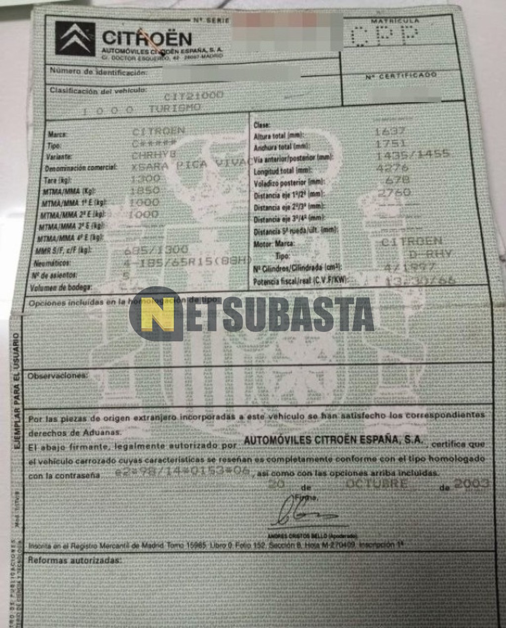 Subasta de Citroën Xsara Picasso 2.0 HDi 2003 Averiados, Marca Citroën, Modelo Xsara Picasso 2.0 HDi, Combustible Diésel, Kilometraje 380.000 KM, Fecha 1ª matriculación 12/2003, Matrícula ****CPP, Color Exterior , Color Interior , IVA REBU y Ubicación Cádiz.