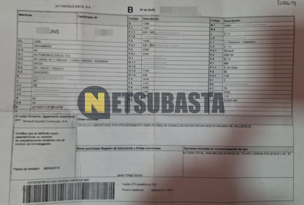 Subasta de Dacia Sandero 0.9 TCE 2016 Averiados, Marca Dacia, Modelo Sandero 0.9 TCE, Combustible Gasolina, Kilometraje 120.000 KM, Fecha 1ª matriculación 05/2016, Matrícula ****JNS, Color Exterior , Color Interior , IVA REBU y Ubicación Madrid.