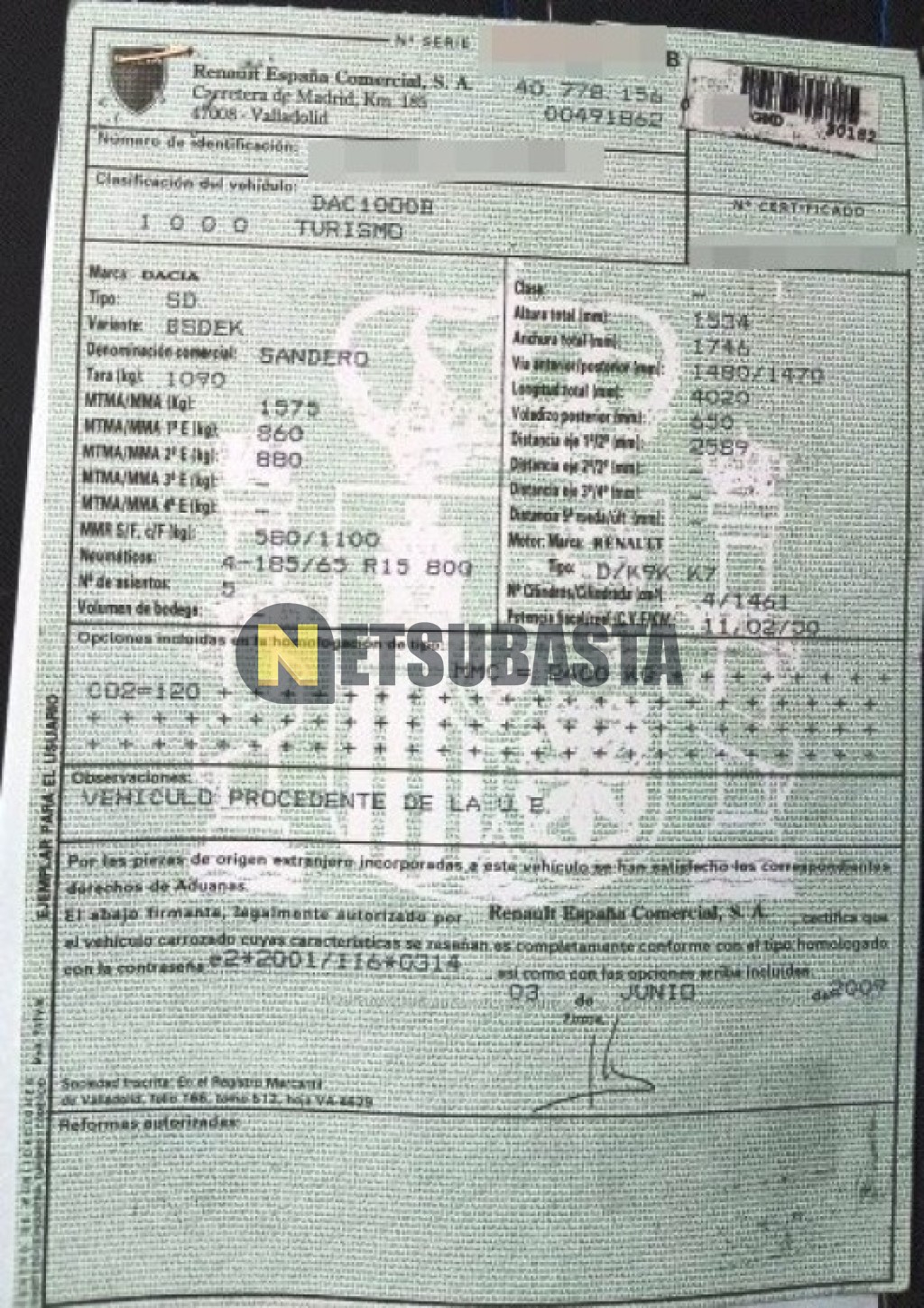 Subasta de Dacia Sandero 1.5 dCi 2009 Averiados, Marca Dacia, Modelo Sandero 1.5 dCi, Combustible Diésel, Kilometraje 240.000 KM, Fecha 1ª matriculación 06/2009, Matrícula ****GND, Color Exterior , Color Interior , IVA REBU y Ubicación Madrid.