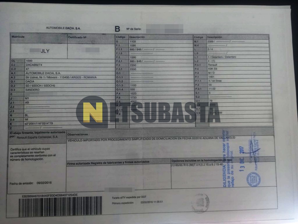 Subasta de Dacia Sandero 1.5 dCi 2016 Averiados, Marca Dacia, Modelo Sandero 1.5 dCi, Combustible Diésel, Kilometraje 305.000 KM, Fecha 1ª matriculación 02/2016, Matrícula ****JLY, Color Exterior , Color Interior , IVA REBU y Ubicación Cáceres.