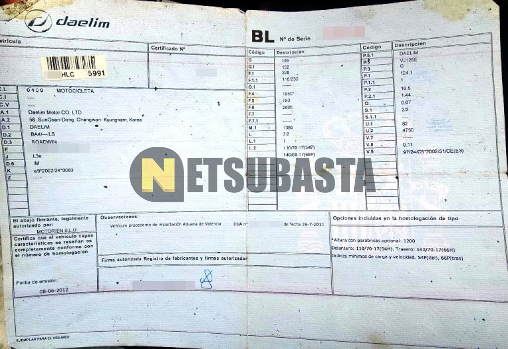 Subasta de Daelim Roadwin 125 2012 Averiados, Marca Daelim, Modelo Roadwin 125, Combustible Gasolina, Kilometraje 52.000 KM, Fecha 1ª matriculación 06/2012, Matrícula ****HLC, Color Exterior , Color Interior , IVA REBU y Ubicación Barcelona.