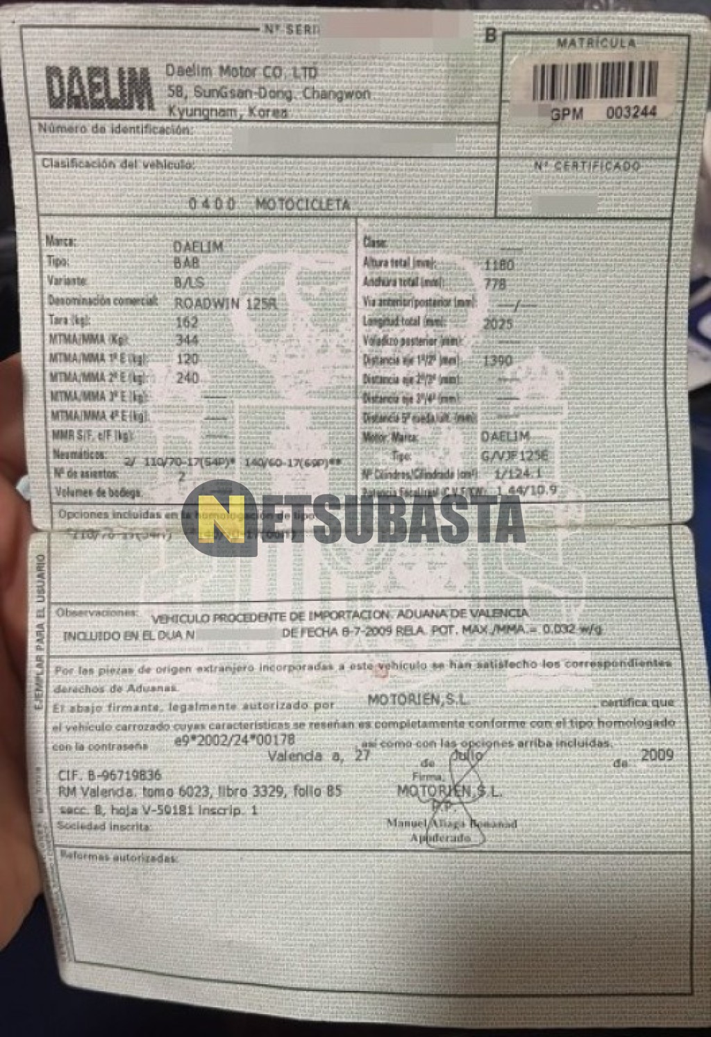 Subasta de Daelim Roadwin 125 R 2009 Averiados, Marca Daelim, Modelo Roadwin 125 R, Combustible Gasolina, Kilometraje 35.000 KM, Fecha 1ª matriculación 09/2009, Matrícula ****GPM, Color Exterior , Color Interior , IVA REBU y Ubicación Valencia.