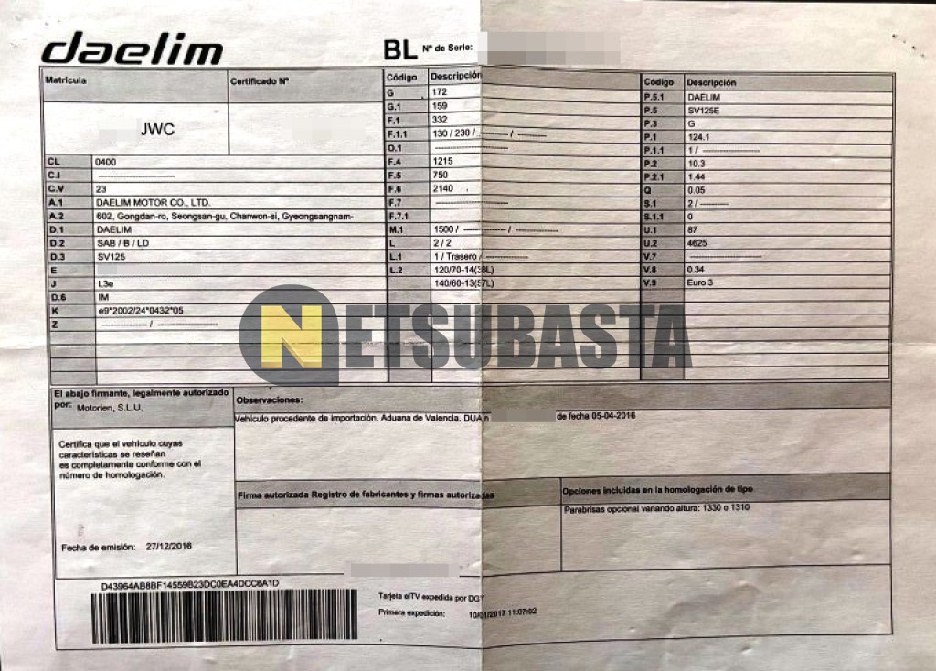 Subasta de Daelim S3 125 2017 Averiados, Marca Daelim, Modelo S3 125, Combustible Gasolina, Kilometraje 30.000 KM, Fecha 1ª matriculación 01/2017, Matrícula ****JWC, Color Exterior , Color Interior , IVA REBU y Ubicación Sevilla.