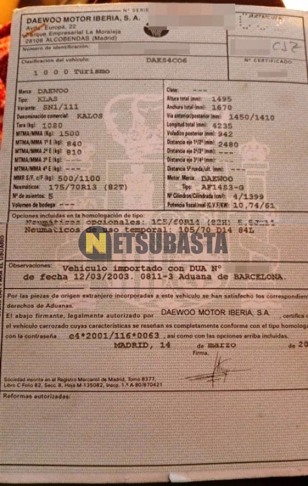 Subasta de Daewoo Kalos 1.4 2003 Averiados, Marca Daewoo, Modelo Kalos 1.4 , Combustible Gasolina, Kilometraje 223.000 KM, Fecha 1ª matriculación 06/2003, Matrícula ****CJZ, Color Exterior , Color Interior , IVA REBU y Ubicación Alicante.