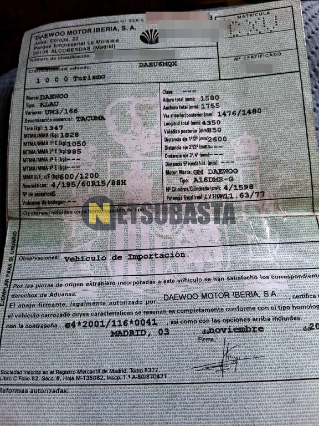 Subasta de Daewoo Tacuma 1.6 16v 2004 Averiados, Marca Daewoo, Modelo Tacuma 1.6 16v, Combustible Gasolina, Kilometraje 140.000 KM, Fecha 1ª matriculación 07/2004, Matrícula ****CXV, Color Exterior , Color Interior , IVA REBU y Ubicación Las Palmas.