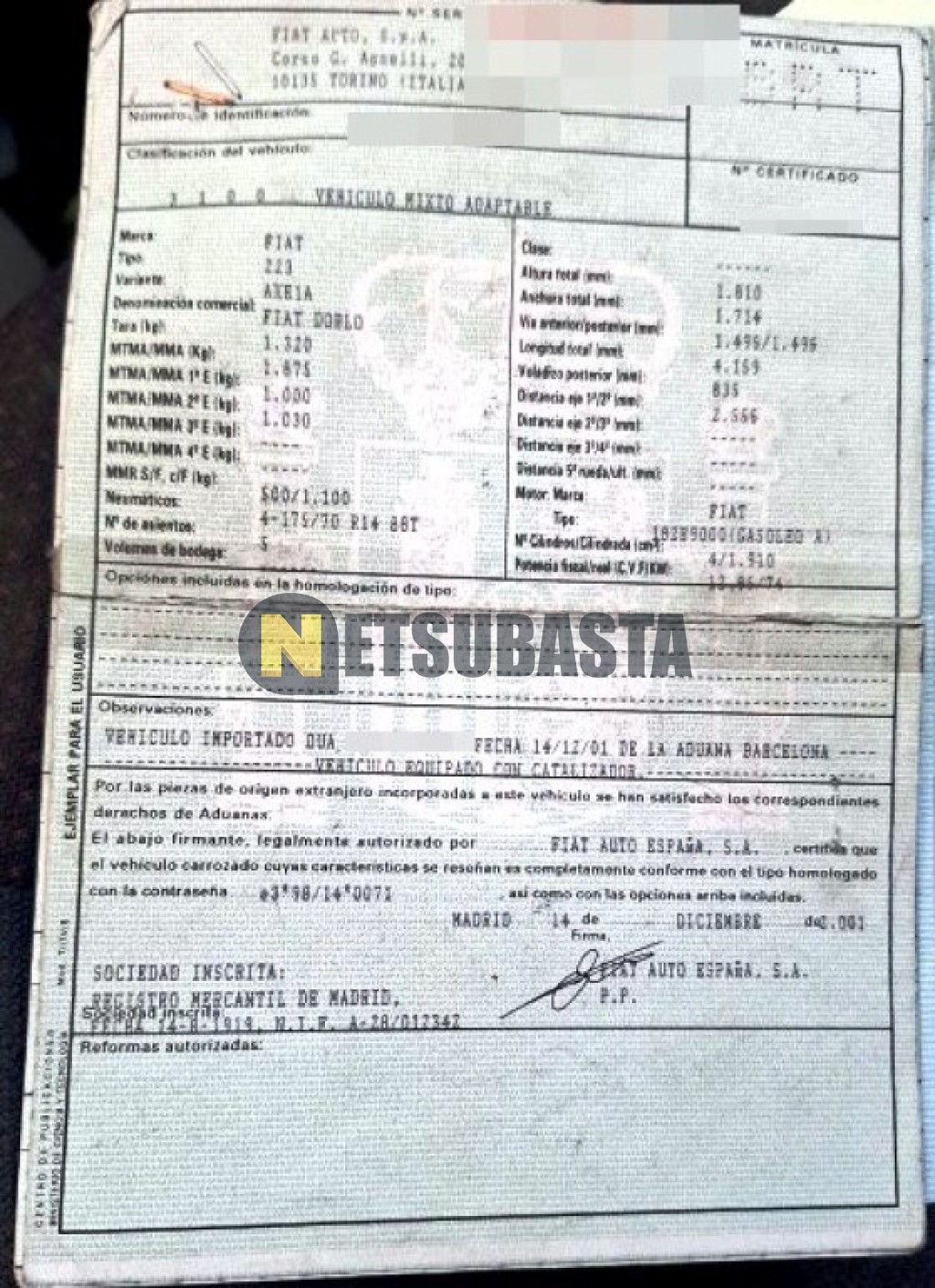 Subasta de Fiat Dobló 1.9 D 2001 Averiados, Marca Fiat, Modelo Dobló 1.9 D, Combustible Gasolina, Kilometraje 258.000 KM , Fecha 1ª matriculación 12/2001, Matrícula ****BRT, Color Exterior , Color Interior , IVA REBU y Ubicación Zaragoza.