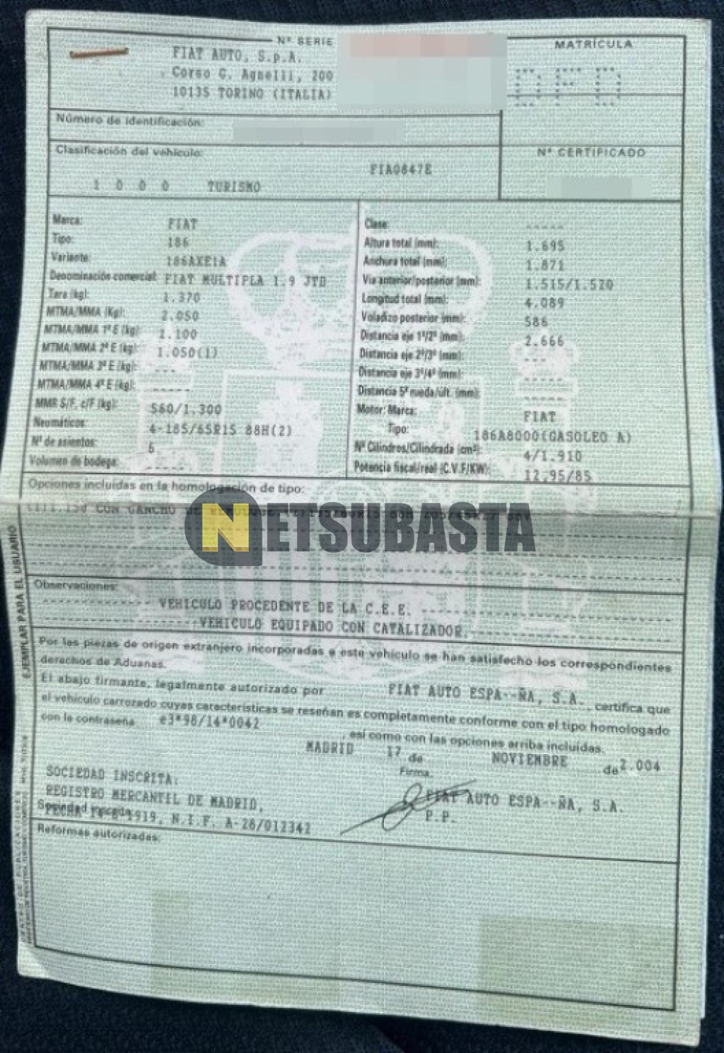 Subasta de Fiat Multipla 1.9 JTD 2004 Siniestrados, Marca Fiat, Modelo Multipla 1.9 JTD, Combustible Diésel, Kilometraje 183.000 KM, Fecha 1ª matriculación 12/2004, Matrícula ****DFD, Color Exterior , Color Interior , IVA REBU y Ubicación Tarragona.