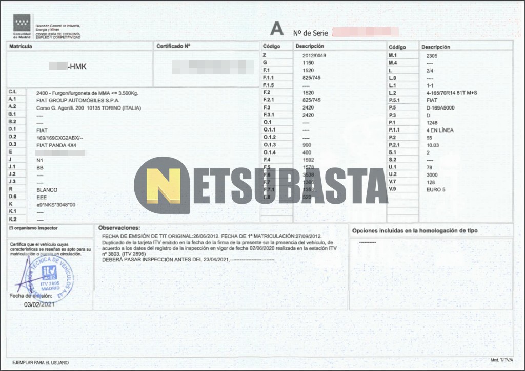 Subasta de Fiat Panda 1.3 Multijet 4x4 2012 Averiados, Marca Fiat, Modelo Panda 1.3 Multijet 4x4, Combustible Diésel, Kilometraje 165.000 KM, Fecha 1ª matriculación 09/2012, Matrícula ****HMK, Color Exterior , Color Interior , IVA REBU y Ubicación Cuenca.