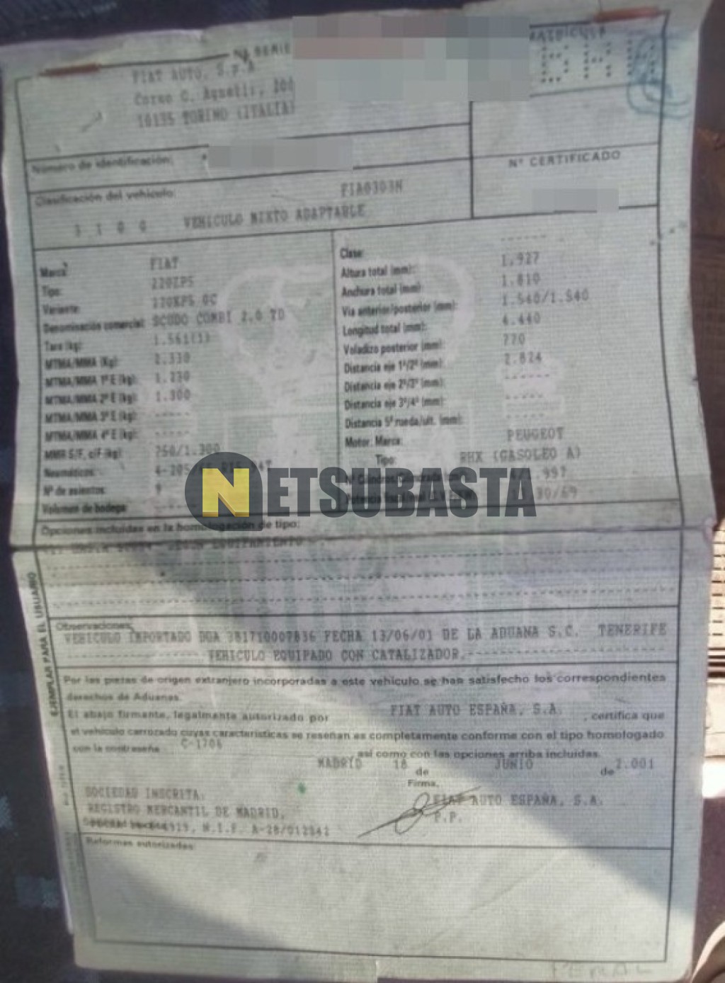 Subasta de Fiat Scudo 2.0 JTD 2001 Averiados, Marca Fiat, Modelo Scudo 2.0 JTD, Combustible Diésel, Kilometraje 180.000 KM, Fecha 1ª matriculación 12/2001, Matrícula ****BRR, Color Exterior , Color Interior , IVA REBU y Ubicación Santa Cruz de Tenerife.
