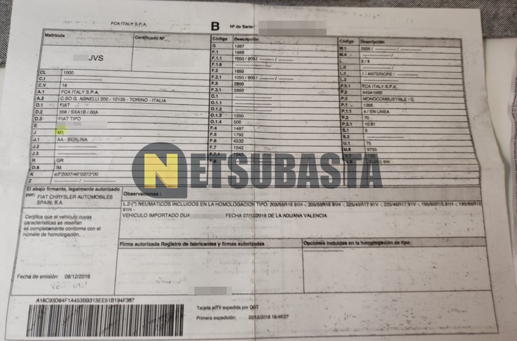 Subasta de Fiat Tipo 1.4 2016 Averiados, Marca Fiat, Modelo Tipo 1.4, Combustible Gasolina, Kilometraje 118.000 KM , Fecha 1ª matriculación 12/2016, Matrícula ****JVS, Color Exterior , Color Interior , IVA REBU y Ubicación Madrid.