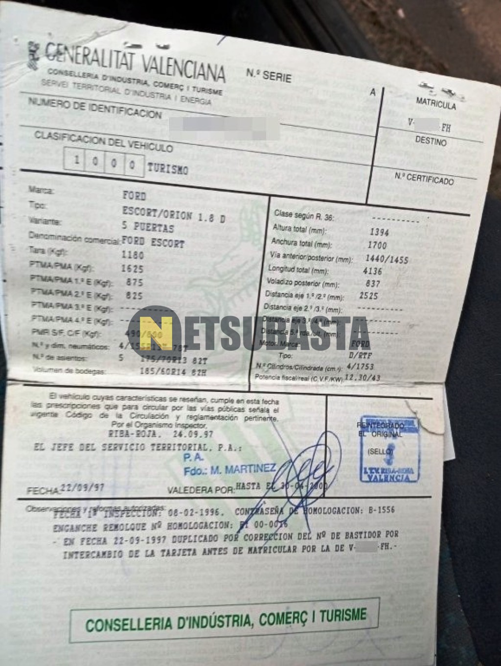 Subasta de Ford Escort 1.8D 1996 Averiados, Marca Ford, Modelo Escort 1.8D, Combustible Diésel, Kilometraje 235.000 KM, Fecha 1ª matriculación 04/1996, Matrícula V****FH, Color Exterior , Color Interior , IVA REBU y Ubicación Valencia.