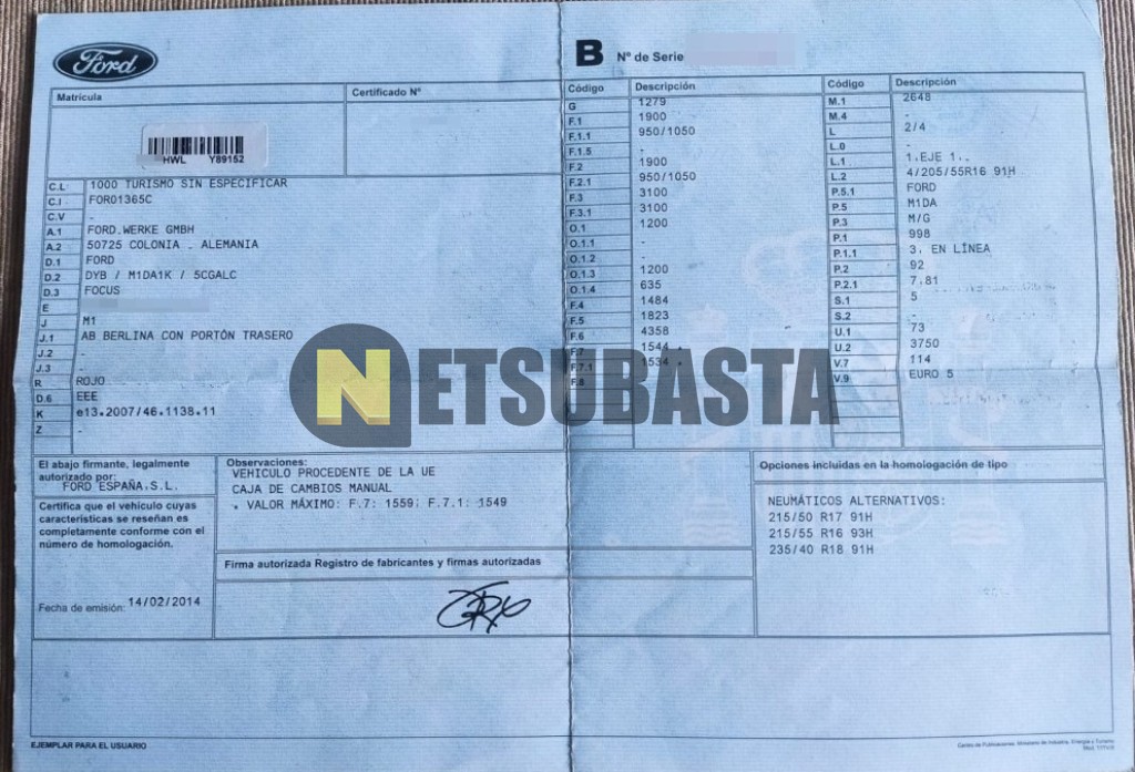 Subasta de Ford Focus 1.0 EcoBoost 2014 Averiados, Marca Ford, Modelo Focus 1.0 EcoBoost, Combustible Gasolina, Kilometraje 170.000 KM, Fecha 1ª matriculación 03/2014, Matrícula ****HWL, Color Exterior , Color Interior , IVA REBU y Ubicación Vizcaya.