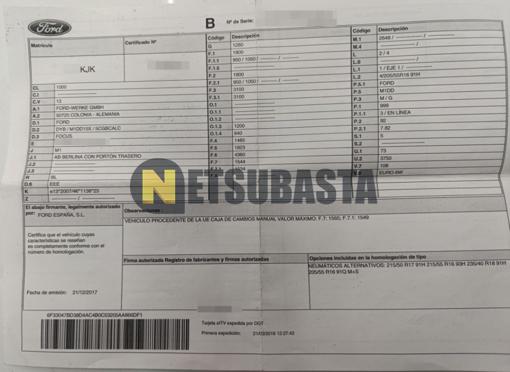 Subasta de Ford Focus 1.0 EcoBoost 2018 Averiados, Marca Ford, Modelo Focus 1.0 EcoBoost, Combustible Gasolina, Kilometraje 126.000 KM, Fecha 1ª matriculación 03/2018, Matrícula ****KJK, Color Exterior , Color Interior , IVA REBU y Ubicación Barcelona.