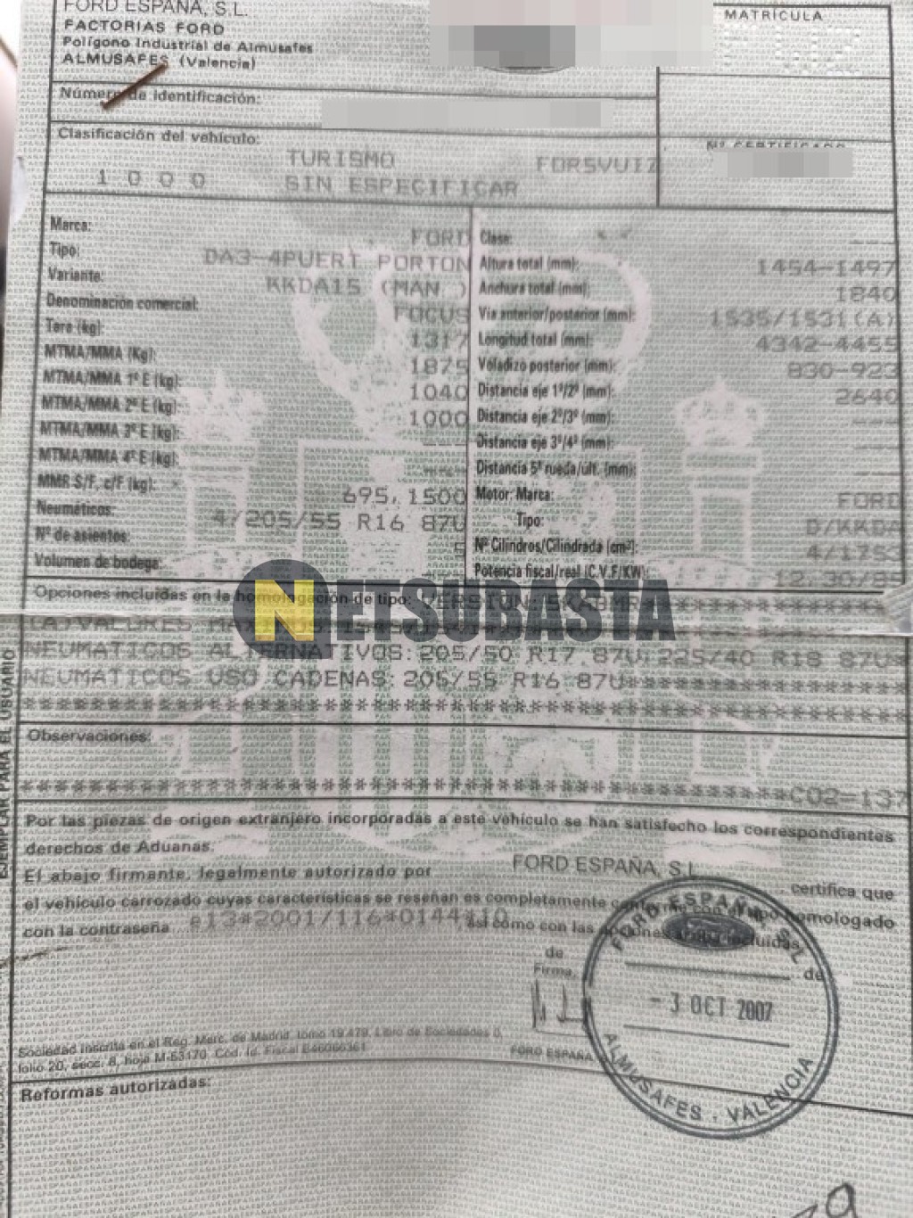 Subasta de Ford Focus 1.8 TDCi 2007 Averiados, Marca Ford, Modelo Focus 1.8 TDCi, Combustible Diésel, Kilometraje 213.000 KM, Fecha 1ª matriculación 10/2007, Matrícula ****FWZ, Color Exterior , Color Interior , IVA REBU y Ubicación Murcia.