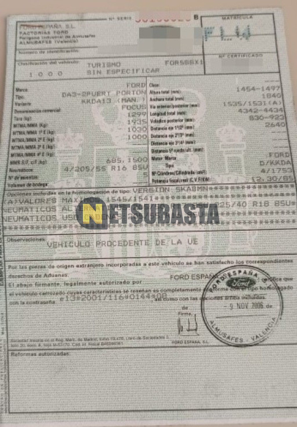 Subasta de Ford Focus 1.8 TDCi 2007 Averiados, Marca Ford, Modelo Focus 1.8 TDCi, Combustible Diésel, Kilometraje 250.000 KM, Fecha 1ª matriculación 03/2007, Matrícula ****FLW, Color Exterior , Color Interior , IVA REBU y Ubicación Tarragona.