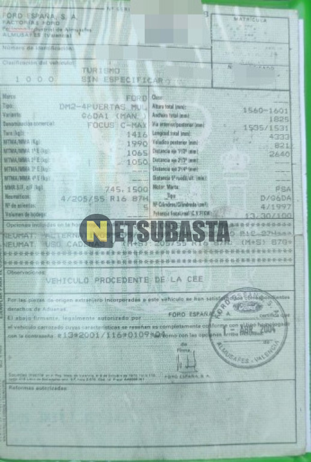 Subasta de Ford Focus C-Max 2.0 TDCi 2004 Averiados, Marca Ford, Modelo Focus C-Max 2.0 TDCi, Combustible Diésel, Kilometraje 325.000 KM, Fecha 1ª matriculación 06/2004, Matrícula ****CXR, Color Exterior , Color Interior , IVA REBU y Ubicación Huesca.