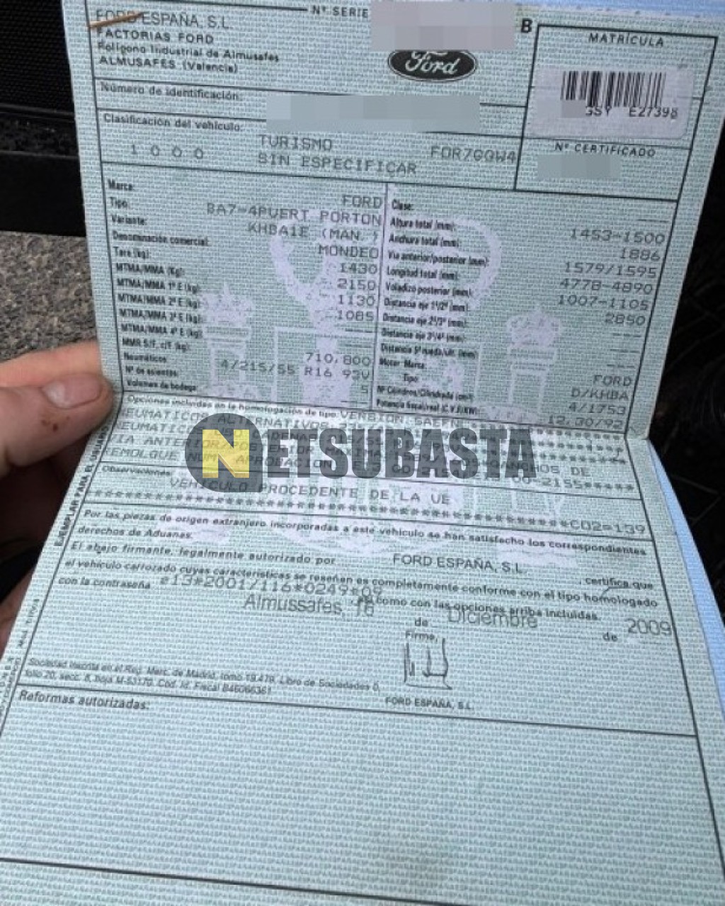 Subasta de Ford Mondeo 1.8 TDCi 2010 Averiados, Marca Ford, Modelo Mondeo 1.8 TDCi, Combustible Diésel, Kilometraje 250.000 KM, Fecha 1ª matriculación 01/2010, Matrícula ****GSY, Color Exterior , Color Interior , IVA REBU y Ubicación Salamanca.