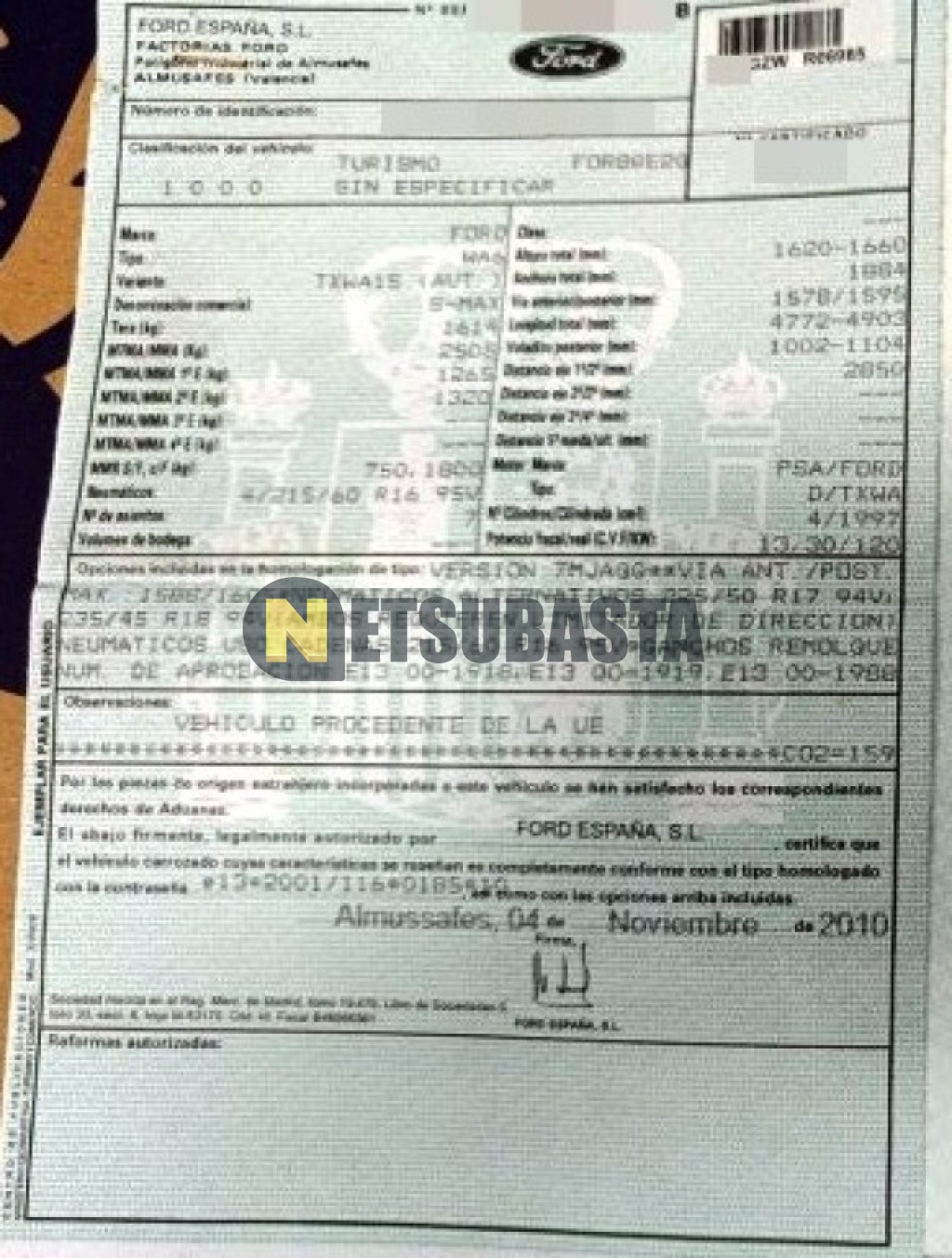 Subasta de Ford S-MAX 2.0 TDCi PowerShift 2010 Averiados, Marca Ford, Modelo S-MAX 2.0 TDCi PowerShift, Combustible Diésel, Kilometraje 220.000 KM, Fecha 1ª matriculación 12/2010, Matrícula ****GZW, Color Exterior , Color Interior , IVA REBU y Ubicación Navarra.