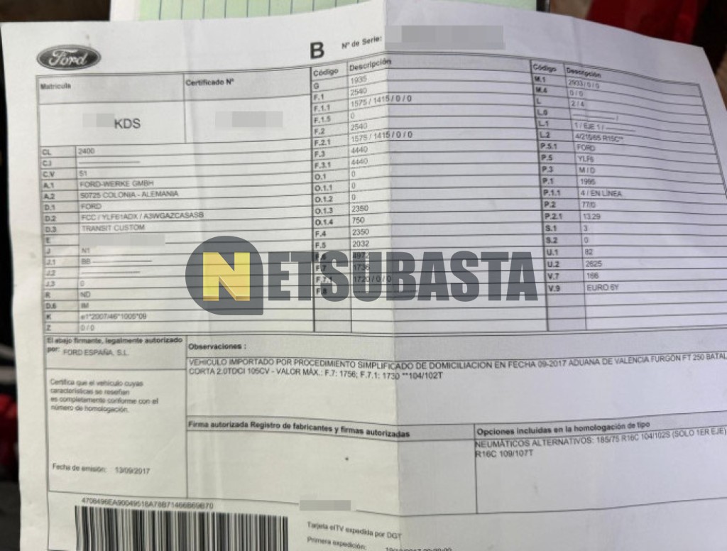 Subasta de Ford Transit Custom 2.0 EcoBlue 2017 Siniestrados, Marca Ford, Modelo Transit Custom 2.0 EcoBlue, Combustible Diésel, Kilometraje 228.000 KM, Fecha 1ª matriculación 10/2017, Matrícula ****KDS, Color Exterior , Color Interior , IVA REBU y Ubicación La Coruña.