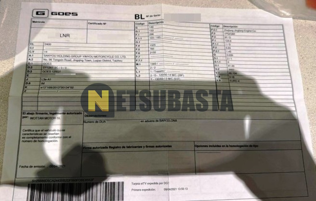 Subasta de Goes G 125 GT 2021 Siniestrados, Marca Goes, Modelo G 125 GT, Combustible Gasolina, Kilometraje 35.000 KM, Fecha 1ª matriculación 04/2021, Matrícula ****LNR, Color Exterior , Color Interior , IVA REBU y Ubicación Gerona.