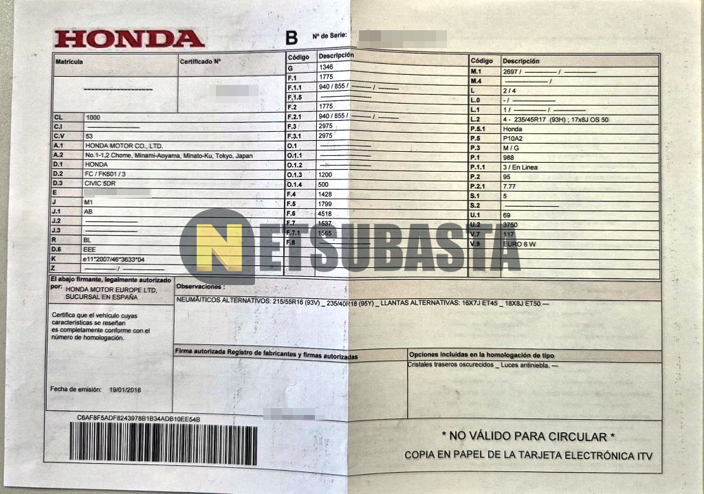 Subasta de Honda Civic 1.0 Turbo VTEC 2018 Averiados, Marca Honda, Modelo Civic 1.0 Turbo VTEC, Combustible Gasolina, Kilometraje 150.000 KM, Fecha 1ª matriculación 08/2018, Matrícula ****KNL, Color Exterior , Color Interior , IVA REBU y Ubicación Valencia.
