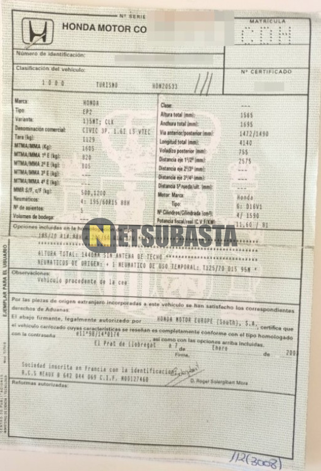 Subasta de Honda Civic 1.6 VTEC 2003 Averiados, Marca Honda, Modelo Civic 1.6 VTEC , Combustible Gasolina, Kilometraje 210.000 KM, Fecha 1ª matriculación 01/2003, Matrícula ****CDH, Color Exterior , Color Interior , IVA REBU y Ubicación Alicante.