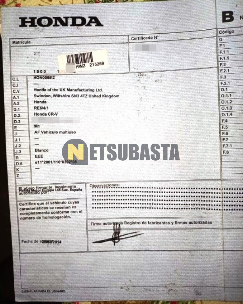 Subasta de Honda CR-V 1.6 i-DTEC 2014 Averiados, Marca Honda, Modelo CR-V 1.6 i-DTEC, Combustible Diésel, Kilometraje 271.000 KM, Fecha 1ª matriculación 04/2014, Matrícula ****HWZ, Color Exterior , Color Interior , IVA REBU y Ubicación Guadalajara.
